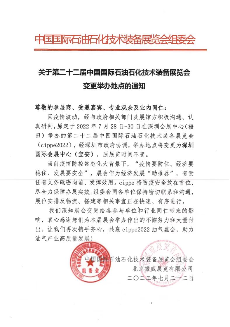 2022-07-20進(jìn)館須知按照深圳疫情防控指揮部及《深圳市會(huì)展活動(dòng)疫情防控工作指引》的各項(xiàng)要求,為切實(shí)維護(hù)參觀商、參展商、搭建商、服務(wù)商、工作人員等所有展會(huì)參與人員的健康安全,切實(shí)保障cippe2022振威石油展順利舉辦,所有入館人員(每次進(jìn)館)均須遵守以下防疫規(guī)定,造成不便敬請(qǐng)諒解。1、深圳市地區(qū):粵康碼綠碼+24小時(shí)內(nèi)核酸陰性證明方.........【詳情】